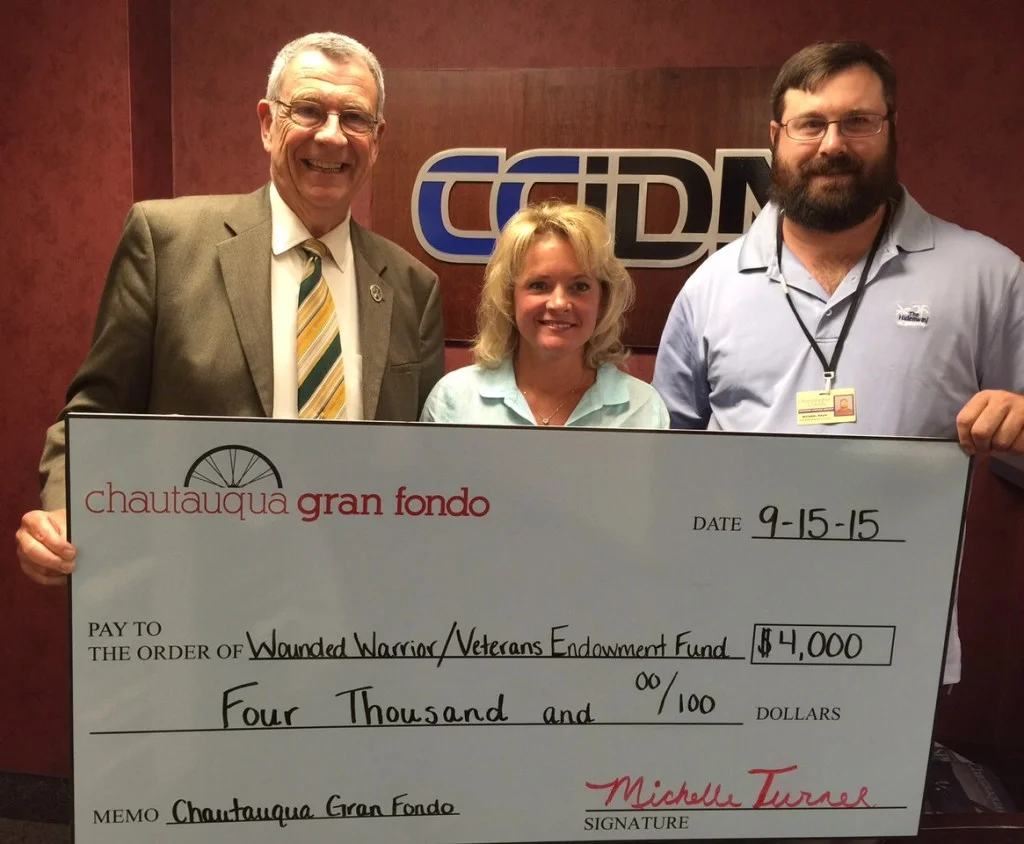 (JAMESTOWN, NY) — The organizers and volunteers of the first annual Chautauqua Gran Fondo worked very hard make the bicycle tour a success. The participants and corporate sponsors gave generously to support the organizations chosen. Amongst the chosen are the Wounded Warrior Project and the Chautauqua County Veterans Endowment Fund. The Gran Fondo donated $4,000 to the Wounded Warrior Project and the endowment fund.